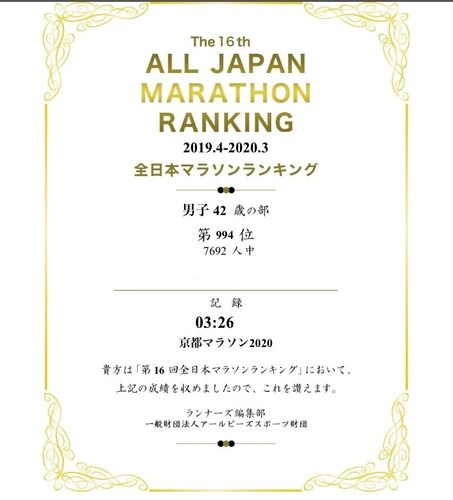 全日本年齢別マラソンランキングが発表されました。 このランキングは、・・・・<引用> 対象となるマラソン大会は2019年4月から2020年3月までで、僕の場合は神戸マラソン、奈良マラソン、京都マラソンの3大会が対象でした。ベストタイムは京都マラソンの3…